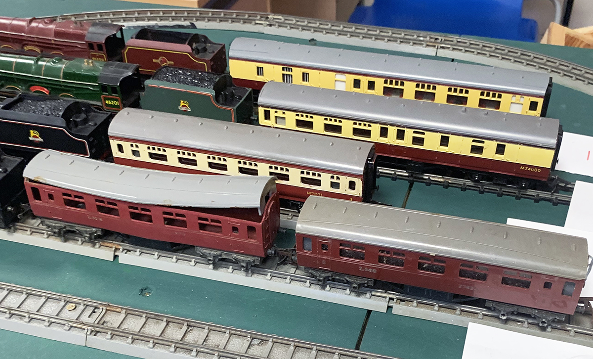 An interesting 2 rail layout of vintage Tri-ang track and stock was running in an adjacent classroom. This also included the infamous early banana shaped coach as a result of Tri-ang use of soft plastic, cellulose acetate. Later models use impact resisting polystrene. Locos running were an elegant Lord of the Isles and an Australian Brush 31.
