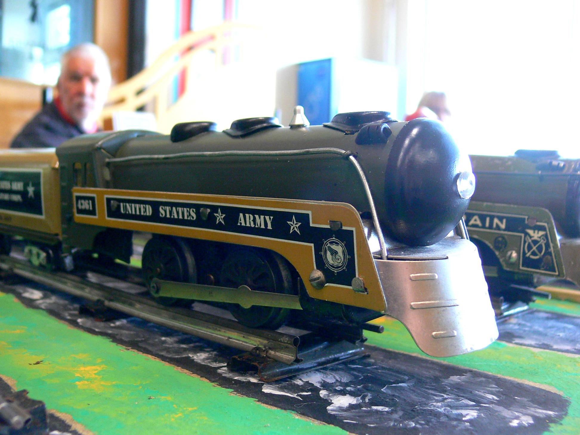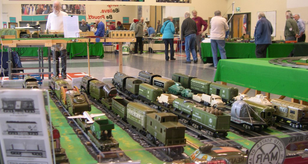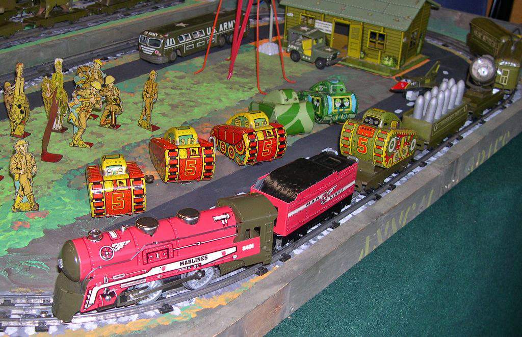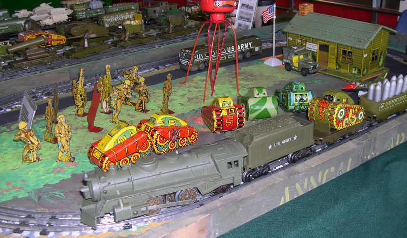 This time a display of Marx locomotives and stock with a military theme.