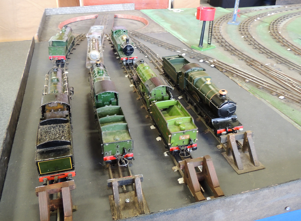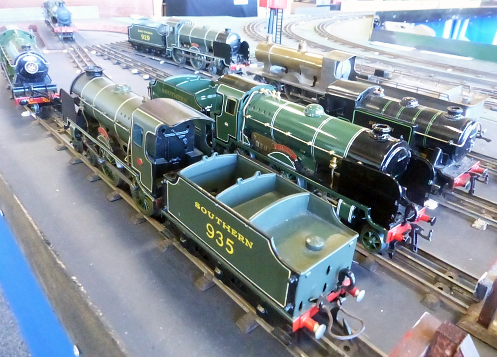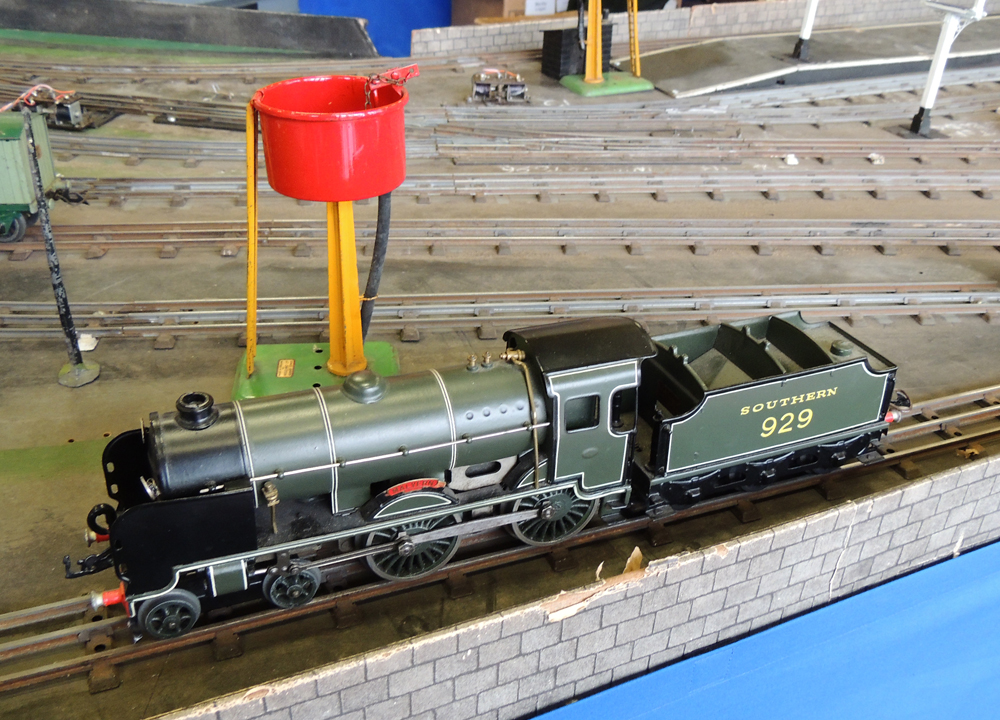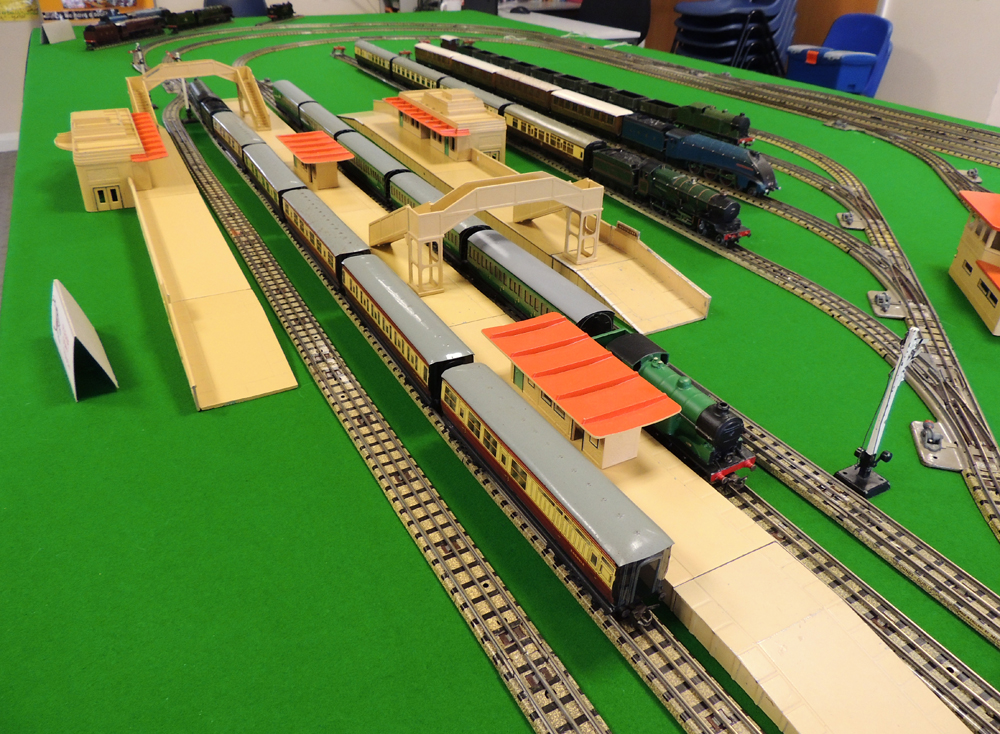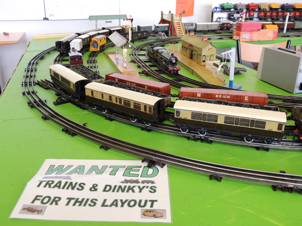 The star layout must be Templeford, an O gauge electric layout, at least 50 years in the making. Originally conceived by the late Laurie Tandy with help from the Malvern Railway club, it had only once been fully assembled in one of his son's double garage. Even then a couple of feet were sticking outside. On Friday evening virtually the whole extended family rallied round to assemble the many sections to ensure it was operational on Saturday. The track was original Hornby solid steel with multiple points, a turntable was included operated by Meccano. Rolling stock was mainly Southern. Noted were 4 Etons each with a different tender numbers. A Bing King Arthur was running now electrified but still with the distinctive key slot in the side.