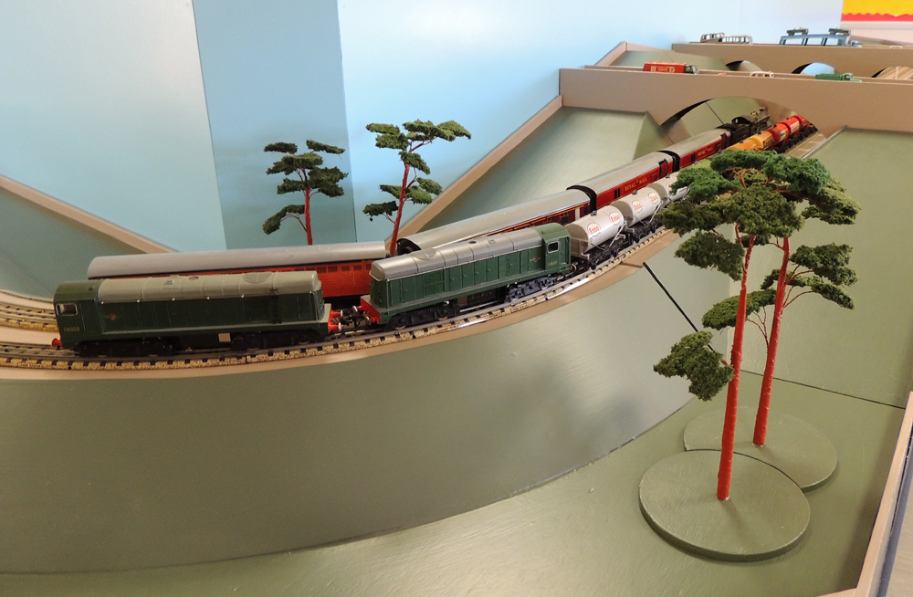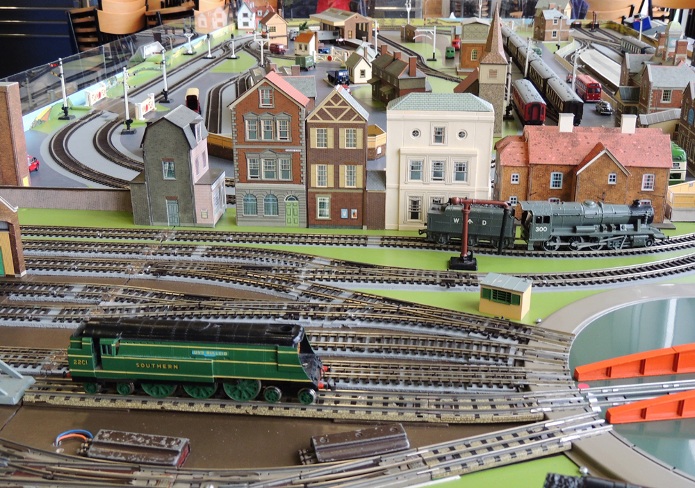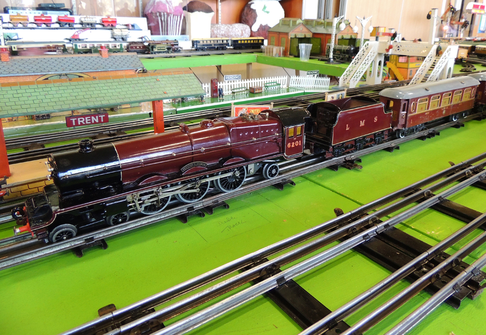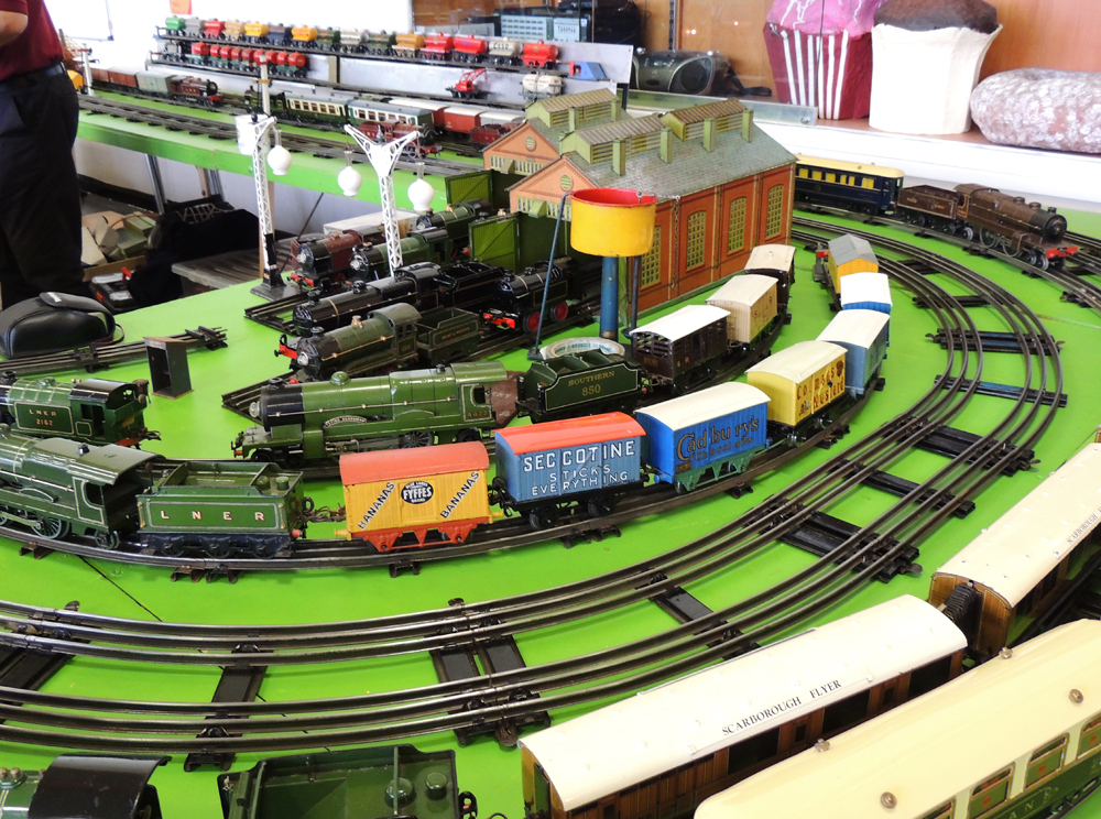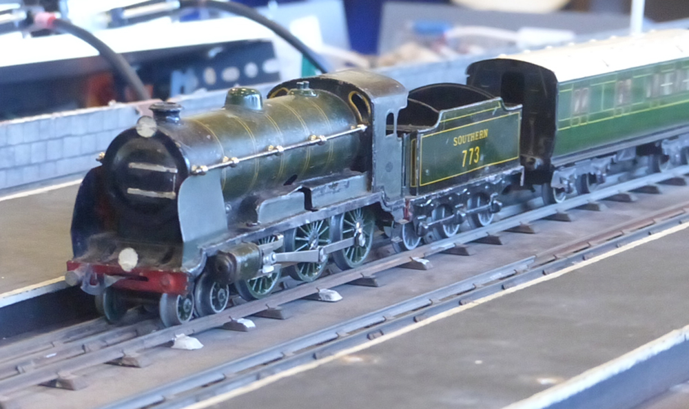 The star layout must be Templeford, an O gauge electric layout, at least 50 years in the making. Originally conceived by the late Laurie Tandy with help from the Malvern Railway club, it had only once been fully assembled in one of his son's double garage. Even then a couple of feet were sticking outside. On Friday evening virtually the whole extended family rallied round to assemble the many sections to ensure it was operational on Saturday. The track was original Hornby solid steel with multiple points, a turntable was included operated by Meccano. Rolling stock was mainly Southern. Noted were 4 Etons each with a different tender numbers. A Bing King Arthur was running now electrified but still with the distinctive key slot in the side.