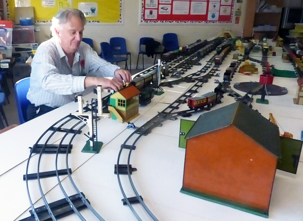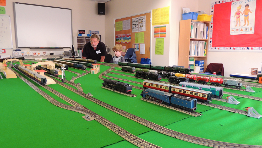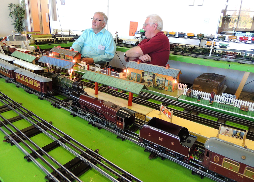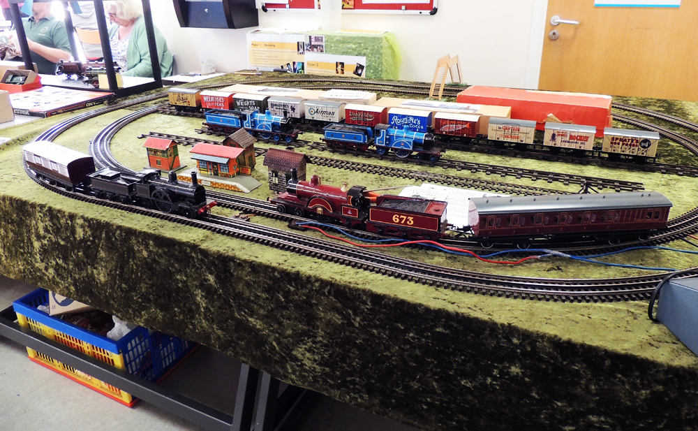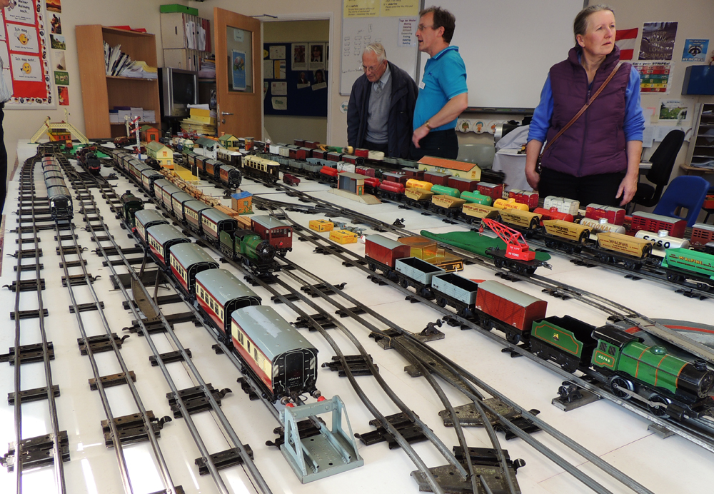 Chris Batten was in a side room running his comprehensive O gauge clockwork layout, with a BR theme, helped by Dave Bailey and several of our younger visitors. Chris's layouts have grown so much that they are set diagonal across the room. Dave always seemed to be winding up a locomotive, often a 30, such that when one locomotive expired after a 100 feet run, the locomotive could immediately be replaced ensuring a continuous service.