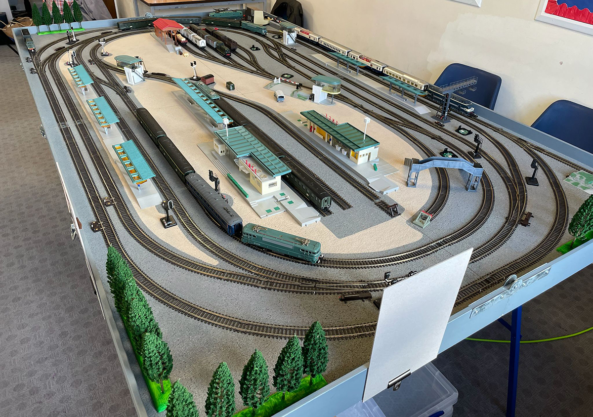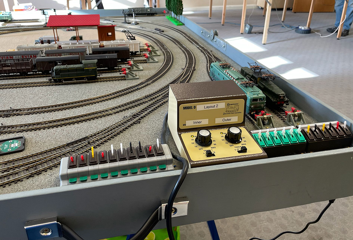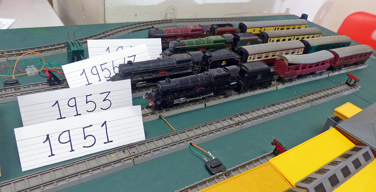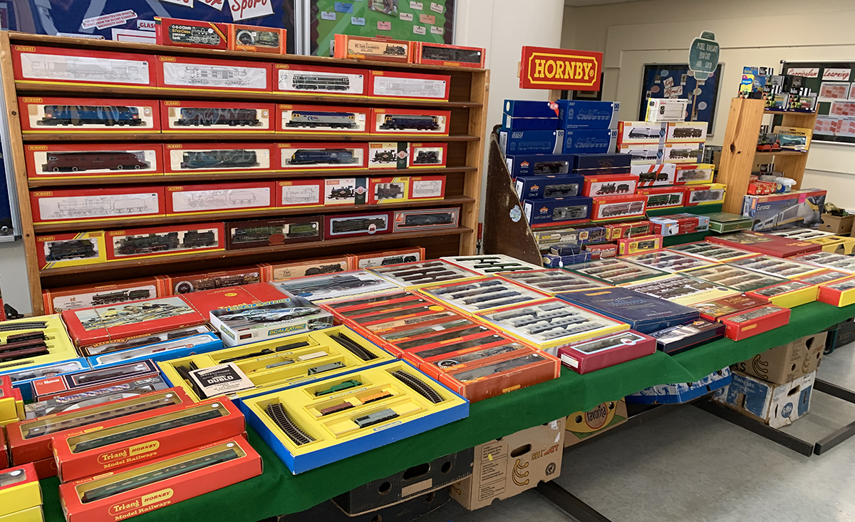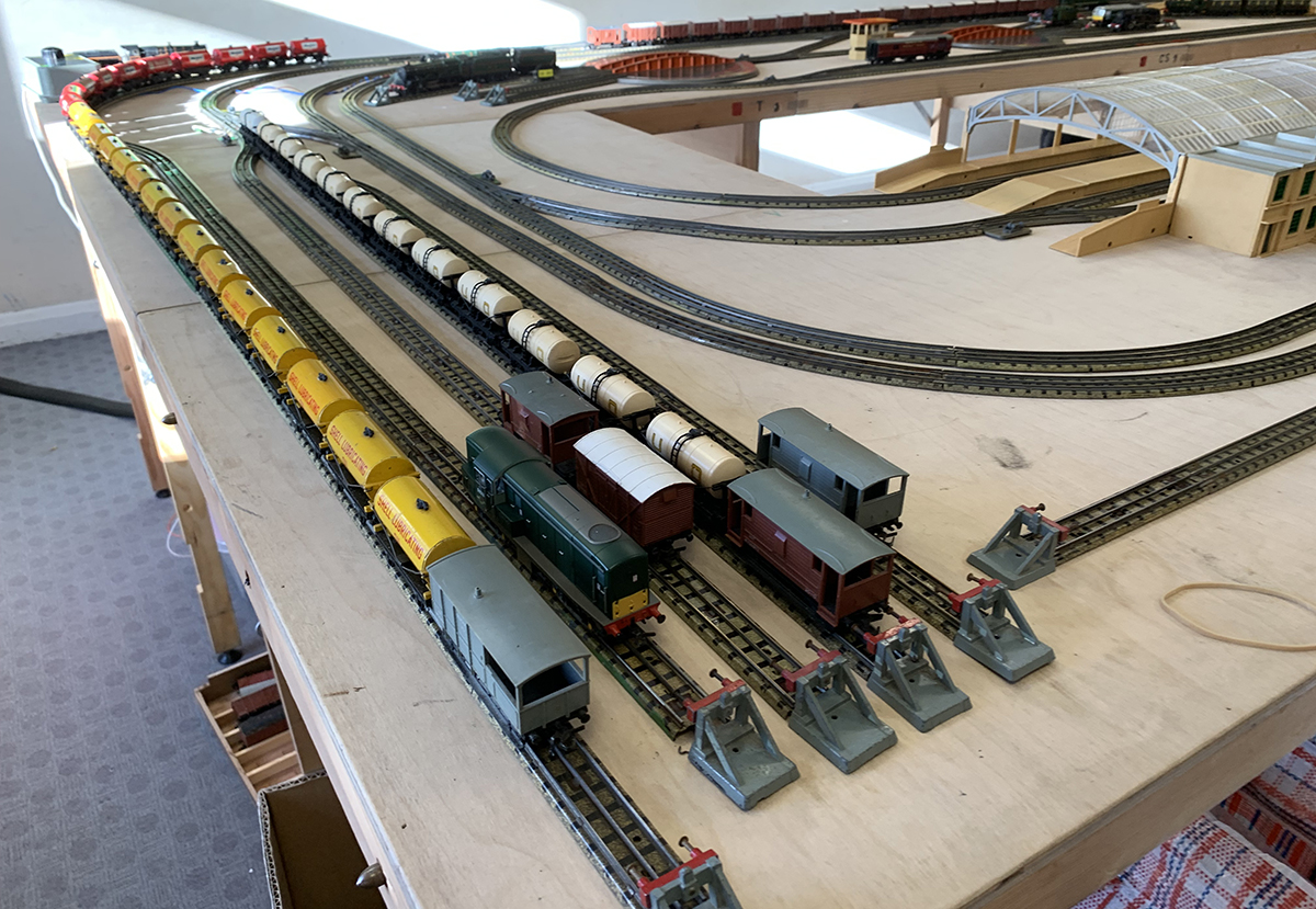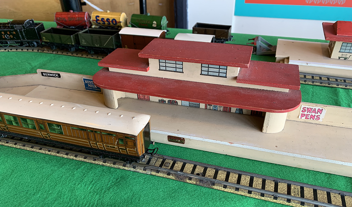 Two other guest displays must be mentioned. Martin Kilford is a regular at our shows and this year did not disappoint with his two rail layout decked out with French Hornby (Acho) buildings and rolling stock. Roger Winterbourne also made a return visit with his Triang display, showing how in the early 50's they improved their offerings to avoid banana shaped roofs etc. Being based in Margate, they introduced a Southern suburban passenger train early in their programme.