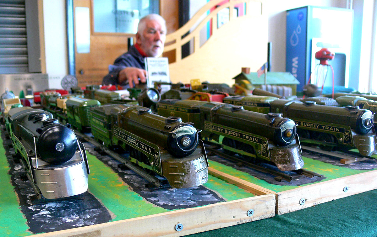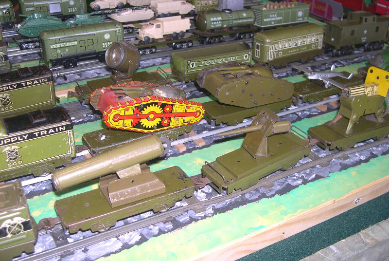 This time a display of Marx locomotives and stock with a military theme.